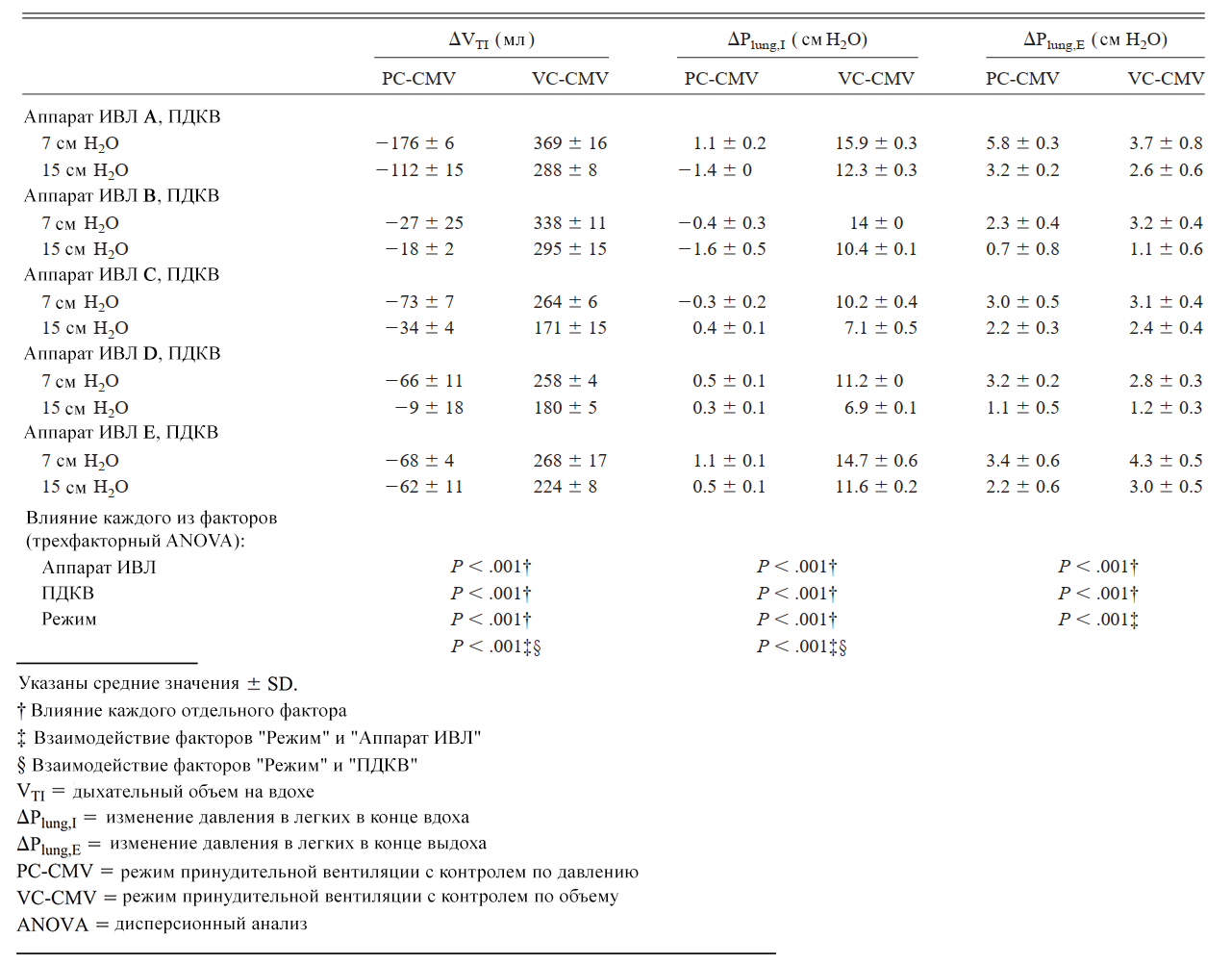 Значение ΔPlung,I в режиме VC-CMV было значимо выше, чем в PC-CMV (Таблица 1). Величина различия ΔVTI в VC-CMV и PC-CMV режимах и абсолютное значение ΔPlung,Iв режиме VC-CMV были клинически значимы при каждом аппарате ИВЛ и значении ПДКВ. Факторы аппарата ИВЛ и ПДКВ имели статистически значимое влияние на ΔPlung,I, как и их взаимодействие с фактором режима вентиляции. Режим вентиляции имел значимое влияние на среднее давление в дыхательных путях. (См. дополнительные материалы на http://www.rcjournal.com.)