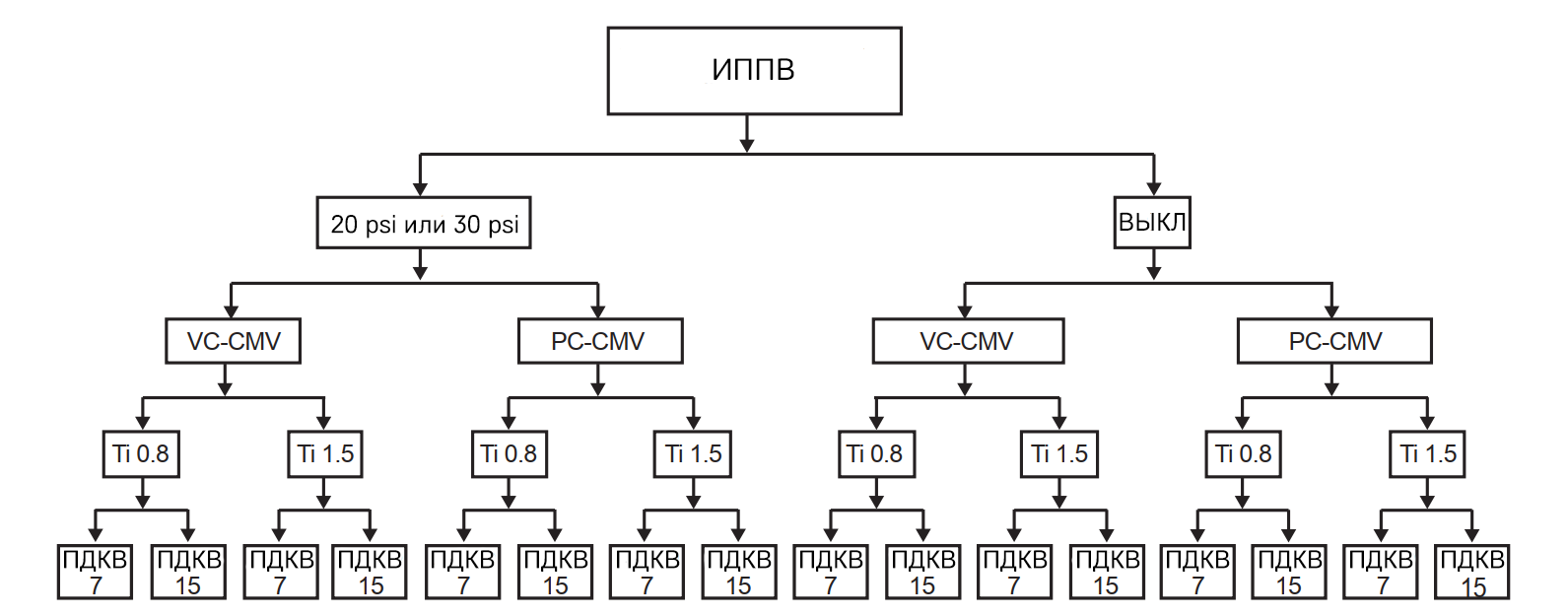 Рисунок 2. Схема дизайна исследования. ИППВ – интрапульмональная перкуссионная вентиляция. PC-CMV – режим принудительной вентиляции легких с контролем по давлению, VC-CMV – режим принудительной вентиляции легких с контролем по объему, TI – время вдоха, ПДКВ – положительное давление в конце выдоха.