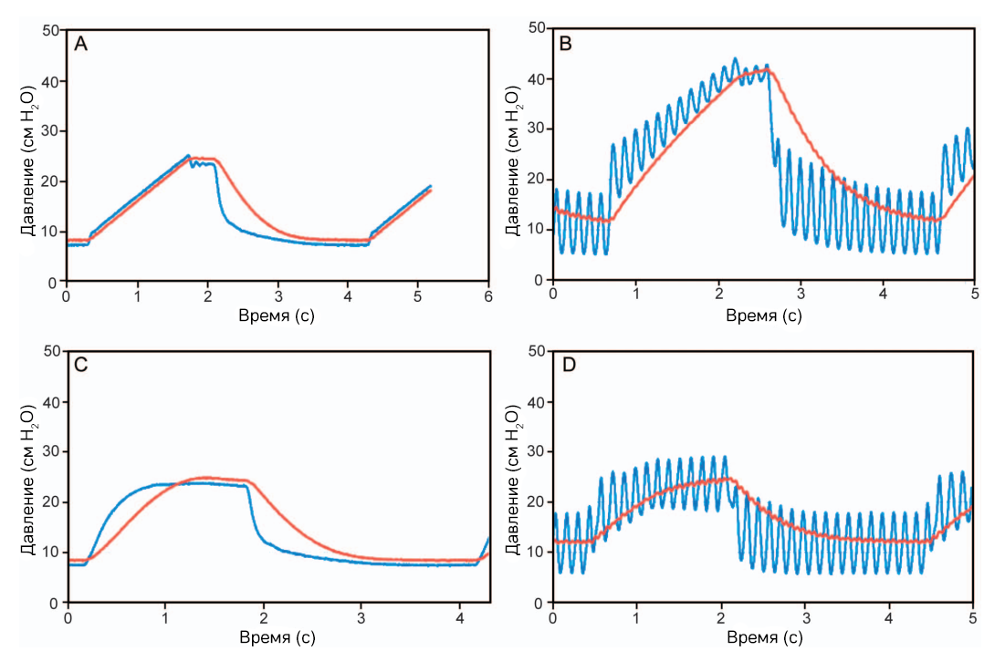 Рисунок 3. Показатели давления на входе в дыхательные пути (синяя кривая) и давления в легких (красная кривая), полученные в режиме принудительной вентиляции с контролем по давлению (PC-CMV) или контролем по объему (VC-CMV) с включенным или выключенным аппаратом ИППВ. A: Режим VC-CMV с ИППВ выкл. B: Режим VC-CMV с ИППВ вкл. C: Режим PC-CMV с ИППВ выкл. D: Режим PC-CMV с ИППВ вкл. Параметры: время вдоха = 1,5 с, рабочее давление = 30 psi, ПДКВ = 7 см вод. ст.